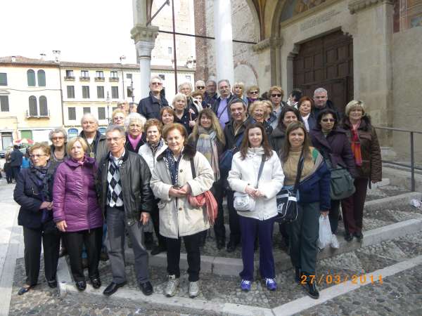 27 marzo 2011, gita domenicale a Bassano del Grappa e Castelfranco Veneto. La foto riprende una parte dei partecipanti sotto l'elegante protiro del 1306 nella chiesa di San Francesco a Bassano del Grappa. L'escursione è stata generalmente valutata in modo positivo per l'interesse artistico dei luoghi visitati, coronata da un soddisfacente pranzo. La foto ci è pervenuta dal socio Umberto Tombesi.