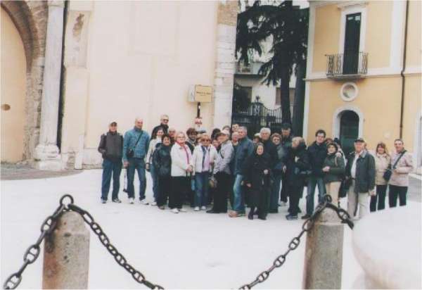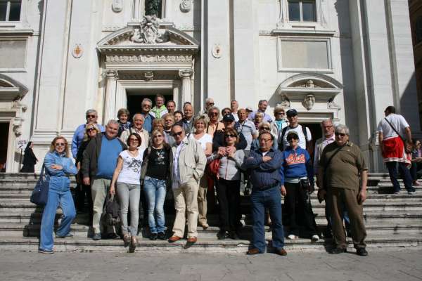 10 aprile 2011, gita domenicale a San Ginesio e Loreto. La foto riprende, in quest'ultima località, parte dei partecipanti in sosta sul sagrato del Santuario della Santa Casa. La gita è stata allietata da una bella giornata di sole, che si è rivelata oltremodo interessante per i pregevoli monumenti d'arte visitati e coronata da un ottimo pranzo di pesce. La foto è pervenuta dal socio Giorgio Brumali.