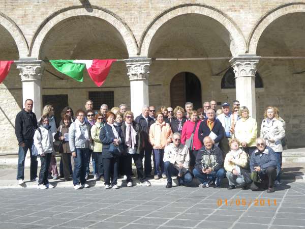 1 Maggio 2011, gita domenicale a Montefalco e Bevagna. Favoriti da una bella giornata di sole i gitanti hanno potuto visitare gli interessanti monumenti che le due belle cittadine umbre, d'impronta medioevale, offrono al turista. Questa foto è stata scattata nella piazza del comune di Montefalco, l'artefice è stato il socio Umberto Tombesi.