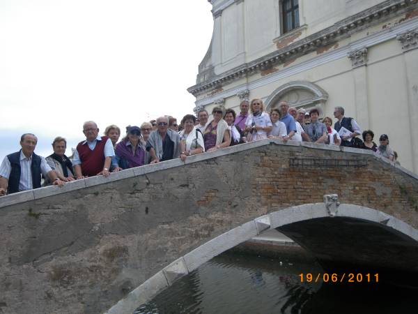 Gita a Chioggia - Isola di Pellestrina del 19 Giugno 2011. La foto è stata scattata a Chioggia e riprende parte dei partecipanti sul ponte dei Filippini davanti alla chiesa omonima. La gita è stata rallegrata da una bella giornata, che è coincisa con la manifestazione medioevale della Marcigliana. Autore dello scatto il socio Umberto Tombesi.
