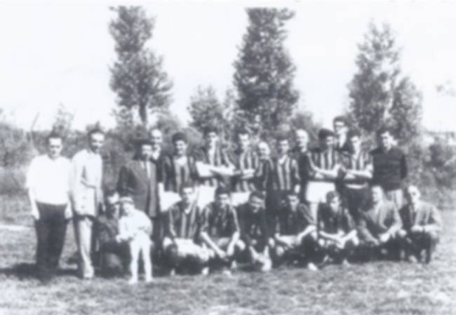 Nella foto, sul campo di calcio Ferrovieri, si riconoscono fra i dirigenti tecnici e sostenitori in piedi da sinistra: Casadei, Ballardini, Capella, Zagnoli, Vannini, Gabellini; ignoti quelli accosciati.