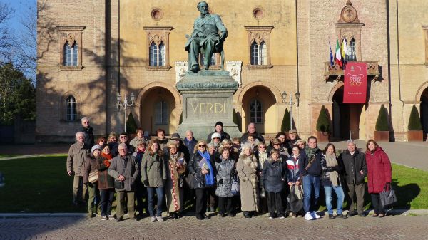 Gita a Roncole - Busseto - Correggio, domenica 26 Gennaio. Favorita da una bella giornata di sole, da un ottimo pranzo e da interessanti visite artistiche culturali il bilancio della giornata è risultato più che positivo. La comitiva è qui ripresa nella piazza centrale di Busseto. Autore dello scatto è stato il socio Marco Rinaldi. Nella circostanza il socio Mario Tonini ha composto nel ricordo di Giuseppe Verdi una poesia in vernacolo, di cui viene riportata questa strofa.