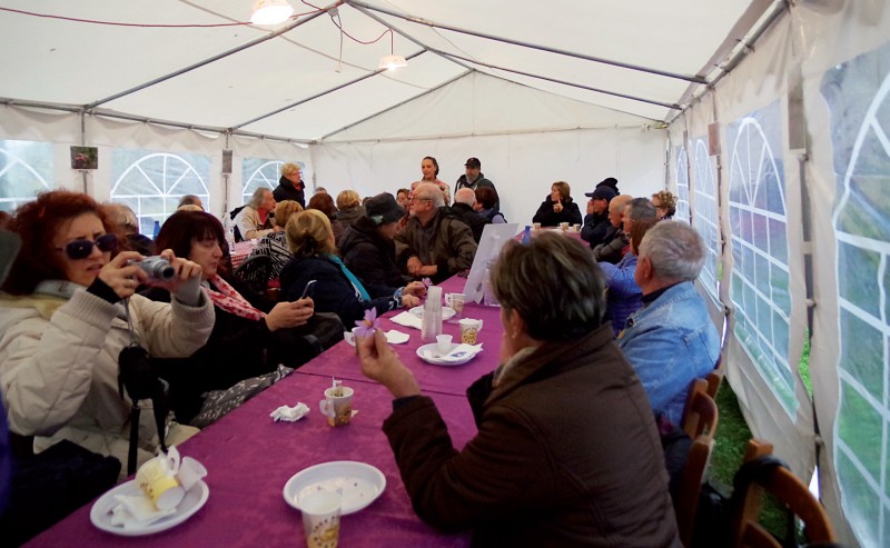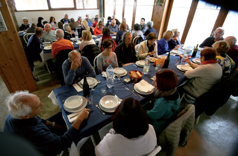 Domenica 15 Ottobre la gita DLF ha raggiunto un castagneto nella zona di Acquapartita dove era stato allestito attorno a un focone un buffet con distribuzione di salumi, formaggi, caldarroste, bruschette e del buon vino Sangiovese. Dopo la raccolta castagne ci si è trasferiti al mercato di Bagno di Romagna per una breve sosta, quindi proseguimento per le Balze dove i partecipanti hanno banchettato. La foto qui scattata riprende i commensali durante quest'ultima fatica; la foto si deve al signor Umberto Tombesi.