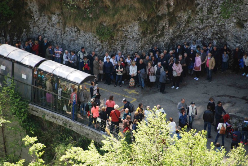 1 maggio - Gitanti DLF hanno raggiunto, nel veronese, le pendici del monte Balbo dove a mezza costa, annidato su uno stretto sperone di roccia, sorge il neogotico Santuario Madonna della Corona. Il sito era affollato all'inverosimile. Dopo la pausa pranzo in ristorante, nel pomeriggio si è proseguito con la breve visita del caratteristico borgo di Lazise, posto nella sponda sudorientale del lago di Garda. La foto pubblicata è stata effettuata alla fermata della navetta di collegamento Santuario - Spiazzi, e testimonia la ressa di persone in attesa di partire, lo scatto è pervenuto dal socio Luciano Patella.