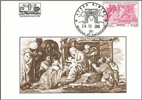 Presentiamo l'annuale cartolina augurale elaborata graficamente da Guido Pasini, cartolina che presenta l'immagine del francobollo natalizio italiano Adorazione dei Magi, presente a Roma presso la Cappella della Civiltà Cattolica, attribuito al pittore Jacopo da Ponte detto il Bassano.