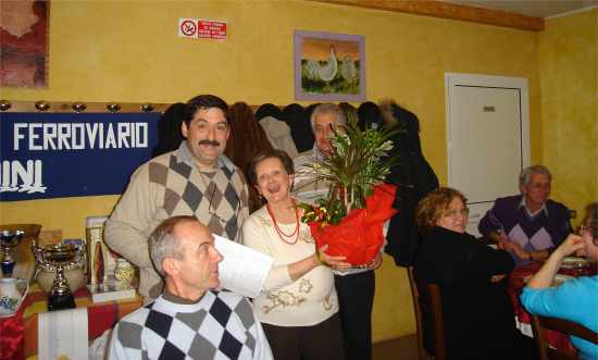 12 gennaio, cena sociale, ristorante Parco Pruccoli, la foto riprende i dirigenti del gruppo Renato Pagliarani, Rino Mulazzani e il primo Responsabile Massimo Bologna mentre procedono alla premiazione della Sig.ra Albertina Dalla Rapa, vedova del compianto Sante Facchini, già valente appassionato podista, che in questi anni si è distinta per il sostegno, anche economico, dato al sodalizio.