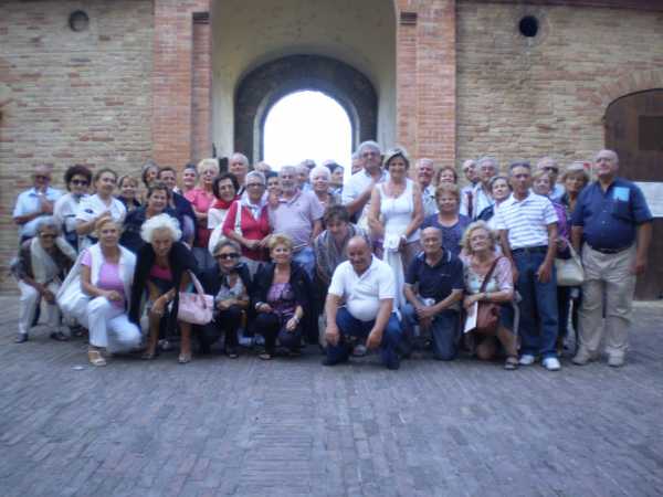 Fotografia pervenuta dalla prof.a Rosanna Battistoni che riprende la comitiva, in posa davanti l'obiettivo, nel cortile del gentilizio Palazzo Venieri di Recanati.
