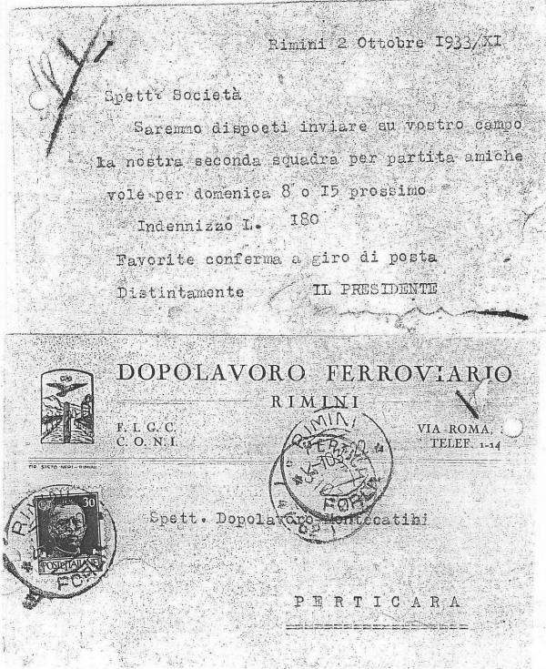 Il signor Ido Rinaldi, che ringraziamo, ci ha consegnato copia di un biglietto postale inviato dal nostro DLF al Dopolavoro Montecatini di Perticara il 2 dicembre 1933. Si ricorda che erano quelli gli anni dove due squadre cittadine si contrapponevano nel gioco del calcio: il Dopolavoro Ferroviario e la Libertas Rimini. La cartolina è un retaggio del passato interessante perché, a causa delle distruzioni provocate dalle vicende belliche del II conflitto mondiale, i bombardamenti rasero al suolo la sede, ben pochi documenti d'anteguerra sono giunti fino ai nostri giorni.