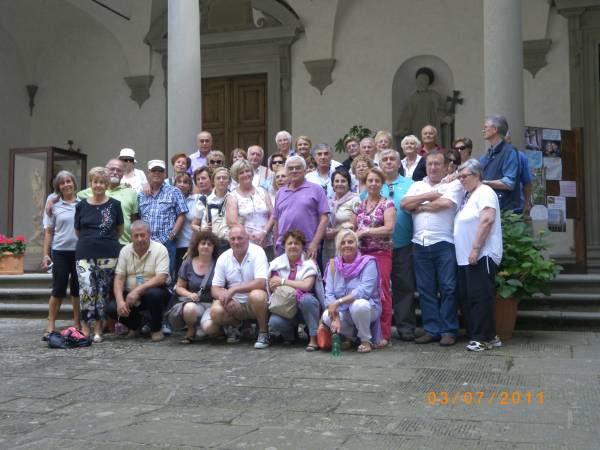 Domenica 3 Luglio 2011, gita a Gaville Valdarno e Vallombrosa. La gita è stata favorita da una bella giornata di sole, ma con temperatura mite. L'interesse artistico ha avuto un buon connubio con quello gastronomico. Una parte della comitiva è qui ripresa di fronte al sagrato della chiesa. Autore del flash il socio Umberto Tombesi.