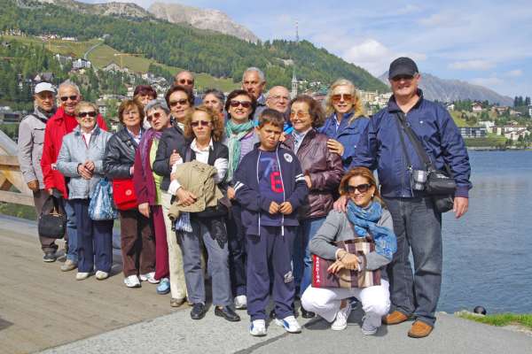Gita sociale a Bormio - Livigno e, con il Trenino del Bernina, a St. Moritz nei giorni 24 e 25 settembre 2011. La gita è stata favorita da splendide giornate di sole. Nell'itinerario previsto l'attrattiva maggiore era il rosso trenino che, puntualmente, non ha tradito le aspettative per le incomparabili suggestive bellezze panoramiche ammirate lungo il suo percorso. Questa foto riprende parte della comitiva ed è stata scattata a St. Moritz dal socio Giancarlo Moro.