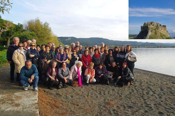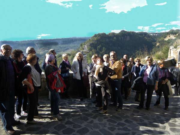 Gita a Bagnoregio-Civita e Città della Pieve del 30 ottobre 2011. Nel contesto delle cittadine raggiunte, tutte per vari versi ammirevoli, quella che sicuramente più ha sorpreso è l'incomparabile fantastica visione del borgo medioevale di Civita, così appollaiato su un greve irto cucuzzolo. Questa foto di gruppo è stata scattata nei pressi del ristorante a Bolsena a ridosso della riva dell'omonimo lago. Autore dello scatto, nel riquadro Civita, il socio Giancarlo Moro.