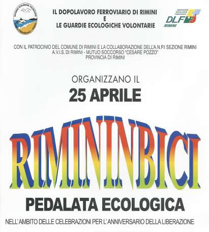 Nella mattina del 25 Aprile si svolgerà la XXI edizione della RIMINBICI la tradizionale, popolare e partecipata pedalata ecologica. La manifestazione organizzata dal nostro Dopolavoro Ferroviario e dalle Guardie Ecologiche Volontarie è patrocinata dal Comune e dalla Provincia di Rimini e si avvale della collaborazione dell'AVIS, dell'ANPI e della Società di Mutuo Soccorso. Ricchi premi in palio.