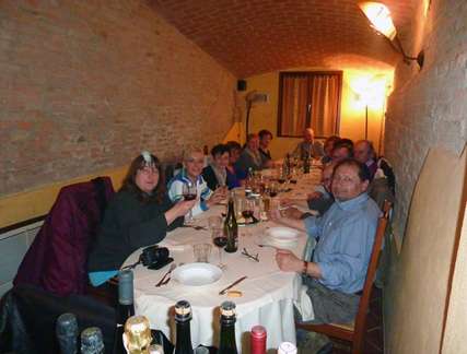 Gita DLF del 22 aprile 2012 con percorso in motonave sulla tratta fluviale Mantova - San Benedetto Po, dove si è sostato per il pranzo; nel ristorante i gitanti hanno trovato posto in più sale. Nel pomeriggio proseguimento per Mirandola. La foto ritrae il gruppo ospitato nella sala dei calici infranti, ed è stata scattata dalla socia Vilma Lotti.