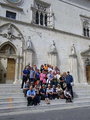 Gita del 10 giugno 2012 a Sulmona e Manoppello. Foto scattata sui gradini del Palazzo dell'Annunziata di Sulmona dal socio Umberto Tombesi. Nel contesto di tale valida escursione vi è da segnalare la gentilezza che ci ha riservato il DLF di Sulmona nella persona del suo presidente sig.ra Franca Festa, venuta a porgere ai partecipanti il suo saluto accompagnato da un piccolo omaggio di ottimi e colorati confetti, prodotto per il quale la città è famosa.