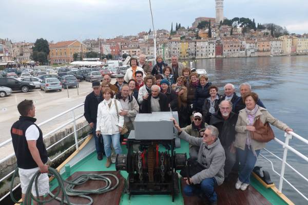 Gita Fiordo di Leme e Isola di Brioni del 20 e 21 aprile; la foto, scattata a Rovigno sulla prua della motonave, riprende parte della comitiva prima dell'attracco in porto. La foto è pervenuta dalla socia Giuseppina Baldacci.