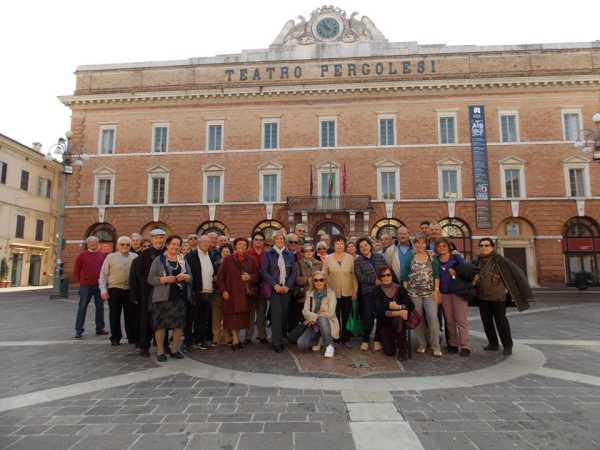 Gita DLF Jesi - Treia di domenica 20 ottobre 2013, una bella giornata di sole ha favorito la visita alle due cittadine. La foto riprende la comitiva in piazza della Repubblica a Jesi con alle spalle l'imponente teatro dedicato a G.B. Pergolesi. Lo scatto è del socio Umberto Tombesi.