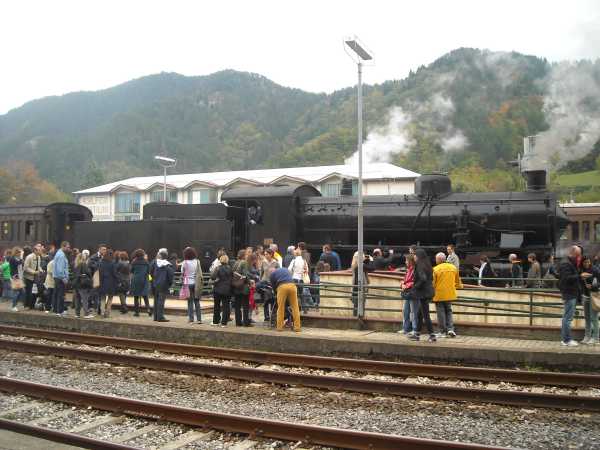 Gita del treno delle castagne del 20 ottobre 2013. Abbiamo ricevuto e pubblichiamo un commento relativo a questa gita: Rimini/Marradi, sarà che mi piacciono molto i treni, sarà che la gente era entusiasta e il meteo più che favorevole (19 gradi), in sostanza la gita mi è piaciuta tanto. Ho avuto la possibilità di scambiare due parole con il capotreno il quale mi ha informata che il treno in questione risale, quasi certamente, al 1908 e chiaramente non dotato di strumenti per misurare la velocità, ma con il gps satellitare sono riusciti a stimare una velocità tra i 60 e i 70 km/h. Considerato che ho avuto una precedente esperienza con il treno a vapore che quella volta era lentissimo (in salita arrancava paurosamente...), e questo era stranamente veloce, il capotreno ha chiarito che avevano agganciato una motrice in fondo al treno per aiutarlo. Ho saputo anche che il treno quando non è utilizzato per eventi particolari, rimane in deposito a Bologna. Secondo me è un vero peccato che non sia consentita la visita al pubblico, anche solo per qualche periodo all'anno. Non solo i bambini sono attratti da questo mezzo di locomozione storico, ma anche e soprattutto i genitori. Abbiamo visto genitori che hanno portato i bimbi di un anno e tantissima gente sia sul treno che alla festa. Unico appunto della gita: troppo tempo a Marradi, si poteva utilizzare parte del pomeriggio per andare a Brisighella a 5 minuti di treno di distanza. Aggiungo che ci siamo sentiti osservati per tutta la durata del viaggio: infatti non solo chi era fermo nelle varie stazioni, ma anche chi percorreva la strada parallela alla ferrovia e chi era nelle campagne, tutti erano armati di macchina fotografica, fotocamere varie e telefoni cellulari che ci riprendevano. Allego qualche foto della giornata. Alla prossima Annamaria Marconi.