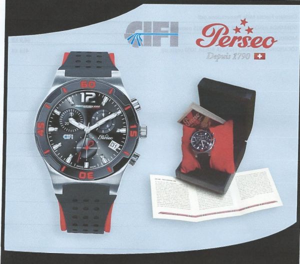 Nuovissimo orologio ufficiale FrecciaRossa 1000 realizzato da Perseo per il CIFI (Collegio Ingegneri Ferroviari Italiani), in serie numerata. Cassa in acciaio, quadrante e fondello personalizzati con loghi ufficiali FS, Cifi e Perseo; cinturino tecnico in silicone; orologio Swiss Made quartz. L'orologio riprende i colori e lo stile del nuovo treno FS FrecciaRossa 1000.