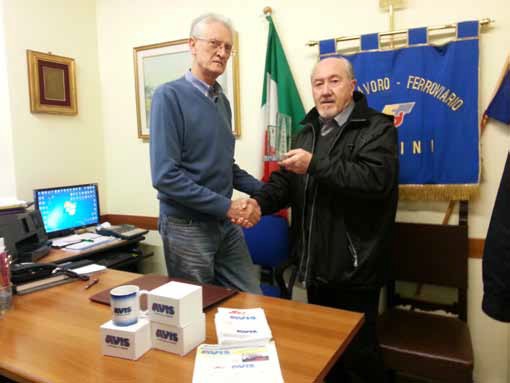 Un solido, crescente, rapporto di collaborazione contrassegna da decenni la vicinanza fra le associazioni DLF e AVIS. Una situazione favorita dai tanti ferrovieri che nell'ambito dell'AVIS, hanno ricoperto posizioni dirigenziali. Quest'anno detta associazione ha festeggiato l'80° della sua fondazione e nella circostanza si è voluto fare dono al DLF di un modellino in vetro del monumento realizzato dai Donatori di Sangue nel parco Giovanni Paolo II. La presente foto è stata scattata nel momento della sua consegna, da parte del dirigente AVIS Tonino Bindi al Presidente DLF Giovanni Vannini.