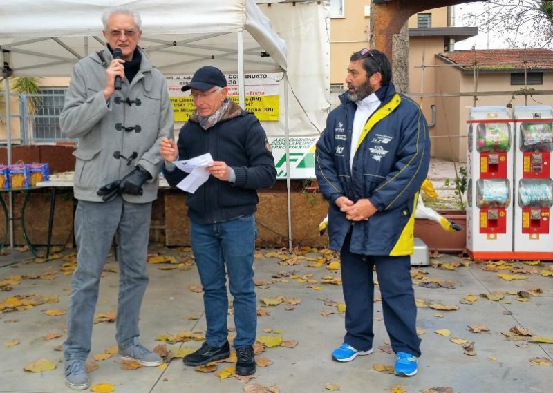 La foto ritrae il Presidente DLF Rimini durante le premiazioni finali, assieme a Giorgio Brumali e al Responsabile Podismo Massimo Bologna.