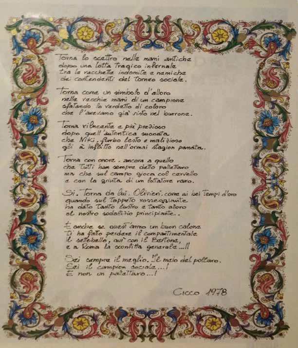 La pergamena, qui pubblicata, è relativa al Torneo Settebello da lui vinto nel 1978, fu stilata da un altro tennista ferroviere, anche lui nativo di Viserba, che per un lungo lasso di tempo concorse in modo rilevante alla promozione del Gruppo Tennis DLF. Il suo impegno gli fu riconosciuto con l'intitolazione alla memoria del Circolo Tennis: Arnaldo Cicconetti (Cicco).