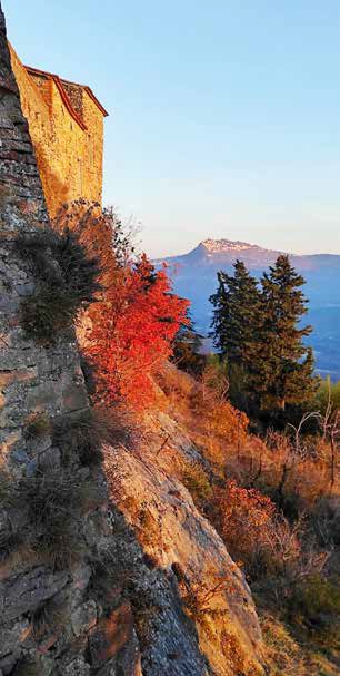 Questa suggestiva immagine autunnale, scattata a Montebello nei pressi della Rocca di Azzurrina, inquadra, in lontananza, la Repubblica del Titano. È proprio questo versante che, nell'agosto del 1849, Giuseppe Garibaldi, con 150 suoi seguaci, seguì, in uscita dalla Repubblica, per cercare di raggiungere e prestare soccorso agli insorti di Venezia che, ancora impavidi, resistevano all'assedio posto dall'esercito austroungarico.