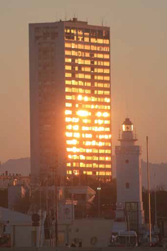 Questa suggestiva, insolita, foto è stata scattata in un tardo pomeriggio invernale e riprende, dal porto canale rivolta alla città, due sue caratteristiche emergenze architettoniche presenti nell'area: lo svettante, mastodontico, grattacielo e il vetusto, esile, faro.